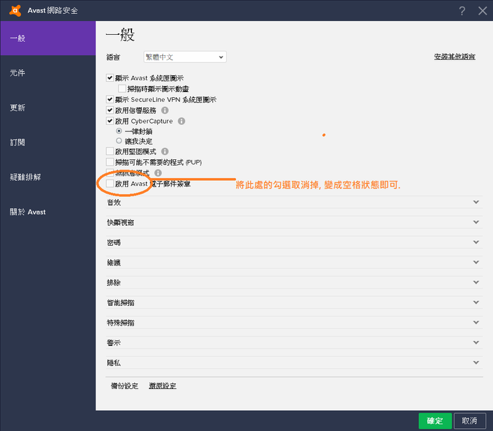 1 ) 打開Avast之後, 點選左下角的[設定]